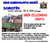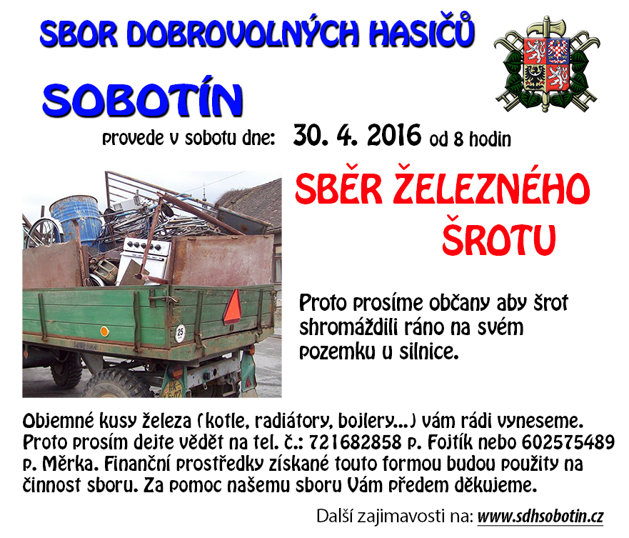 Sbor dobrovolných hasičů Sobotín provede v sobotu 30. 4. 2016 od 8 hodin SBĚR ŽELEZNÉHO ŠROTU. Proto prosíme občany aby šrot shromáždili v sobotu ráno na svém pozemku u silnice. Vyneseme i těžké kusy. Více info a popřípadě kvůli snesení těžkých kusů např. bojlerů, kotlů atd. volejte na tel.: 721 682 858 p. Fojtík Jiří nebo 602 575 489 p. Měrka Zdeněk.